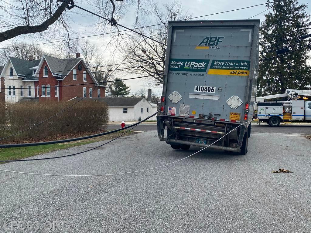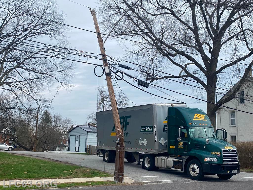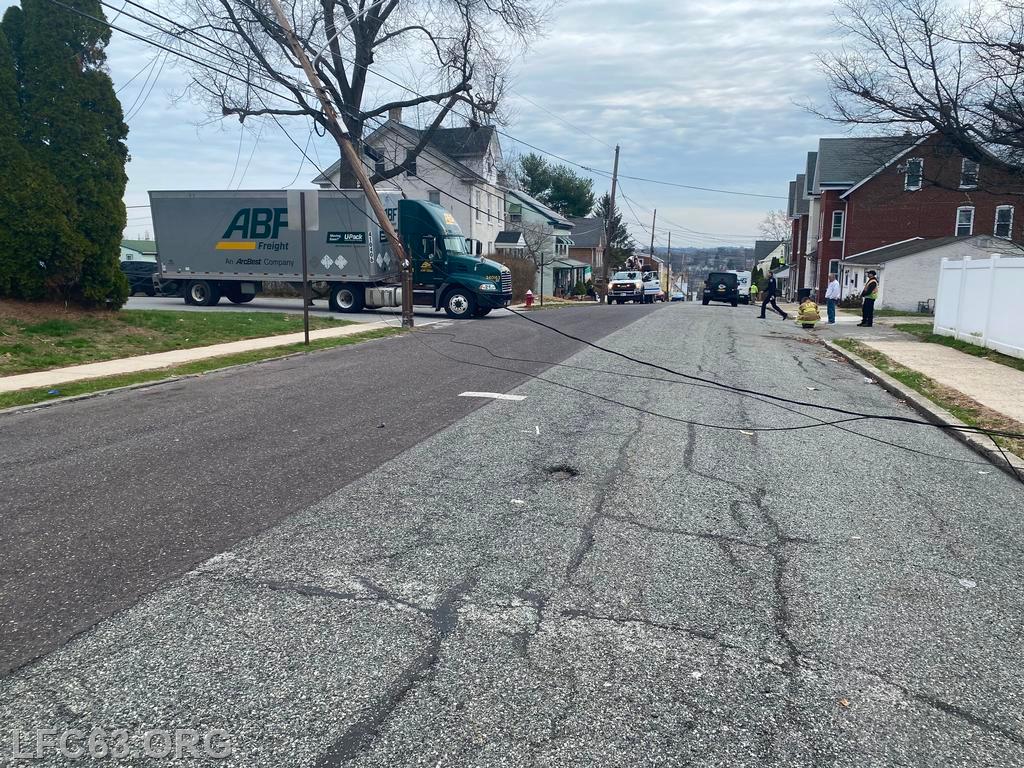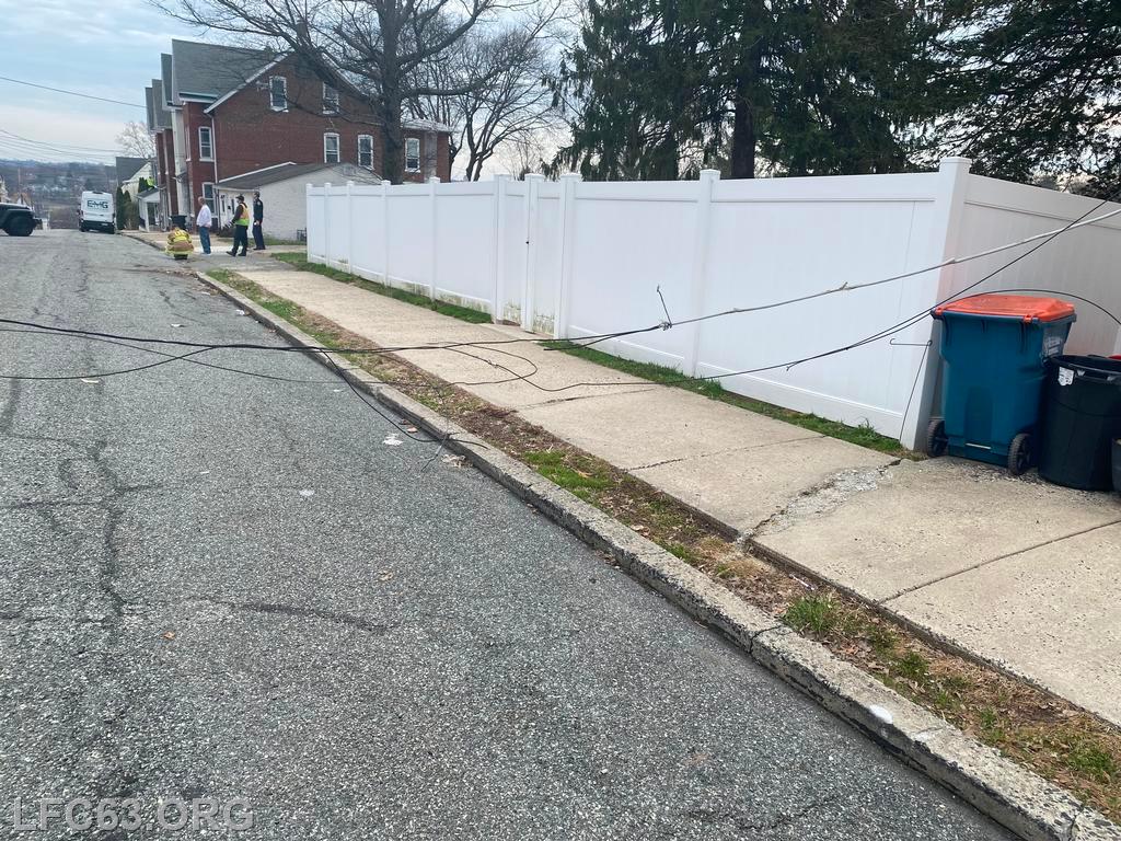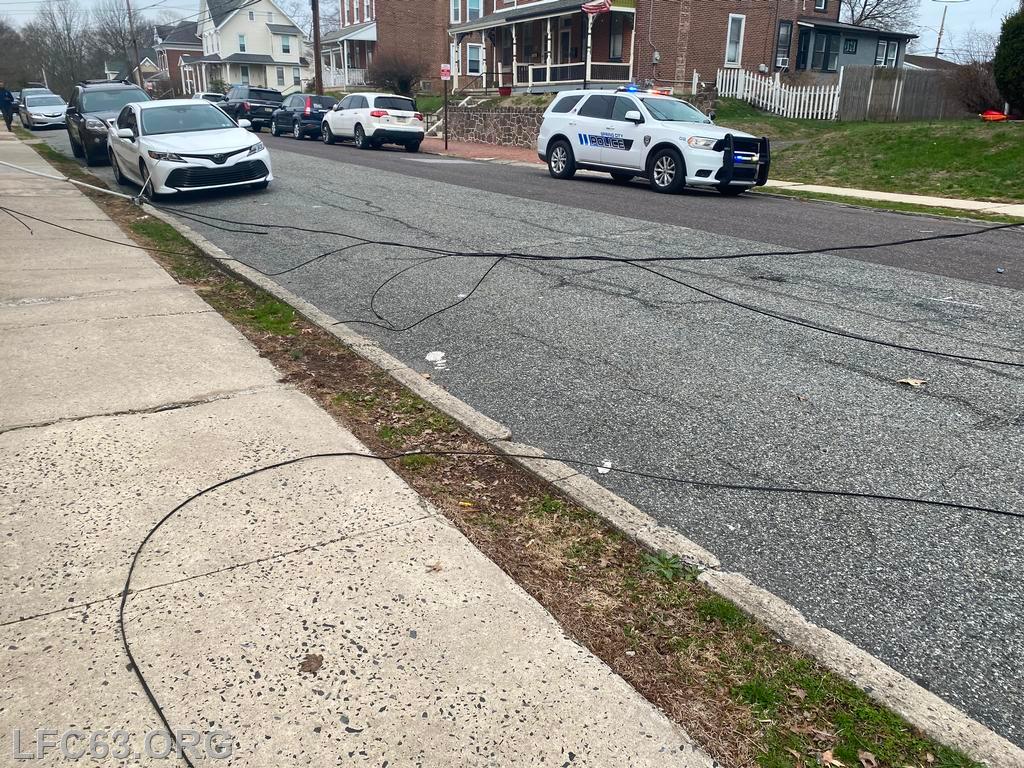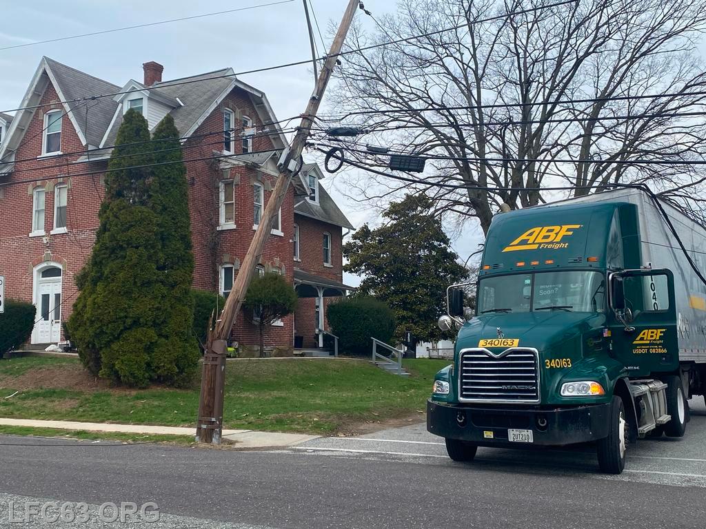At 09.59 this morning LFC was dispatched to the area of 273 Chestnut Street for a reported pole fire, Squad 63 responded shortly after dispatch followed by Traffic 63 arriving on location Squad 63 found a Tractor Trailer had got caught in low hanging wires bringing two poles and several wires down in the roadway and immediately made a PECO notification. Squad 63 secured the area and Traffic 63 closed the roadway in both directions. Royersford Fire Department MENG98 also responded. Squad 63 and RFD went available about an hour later and Traffic 63 remained on location and cleared at 12.30 after the Spring City Borough Street Crew set road closed signs up while the Utility Crews worked on the problem.