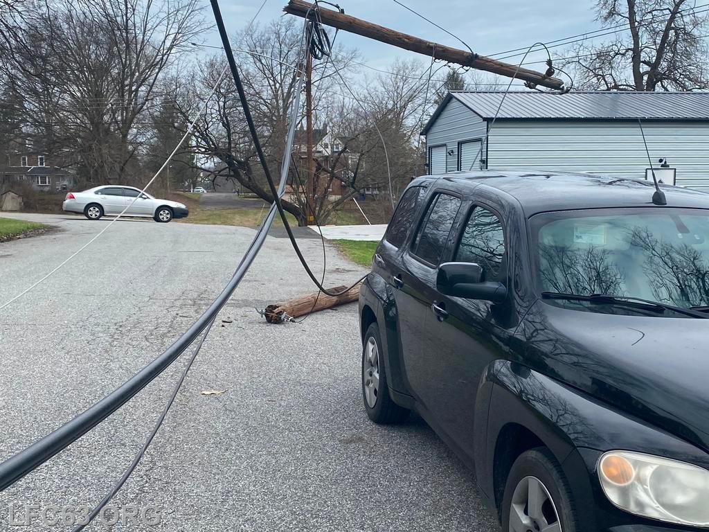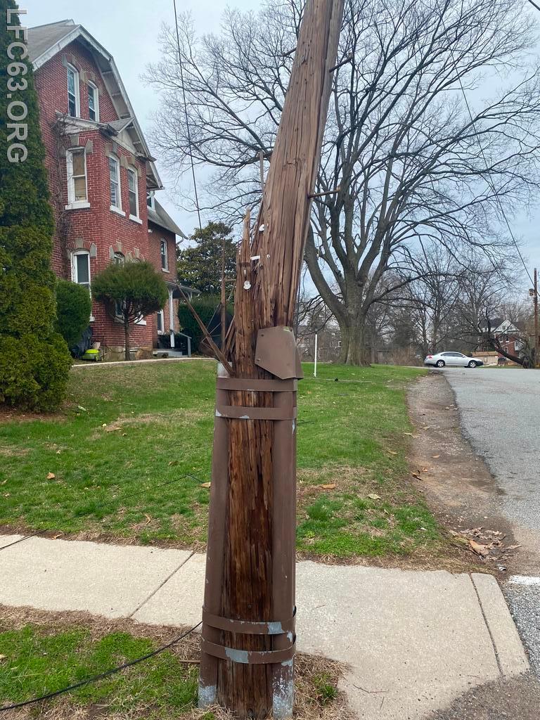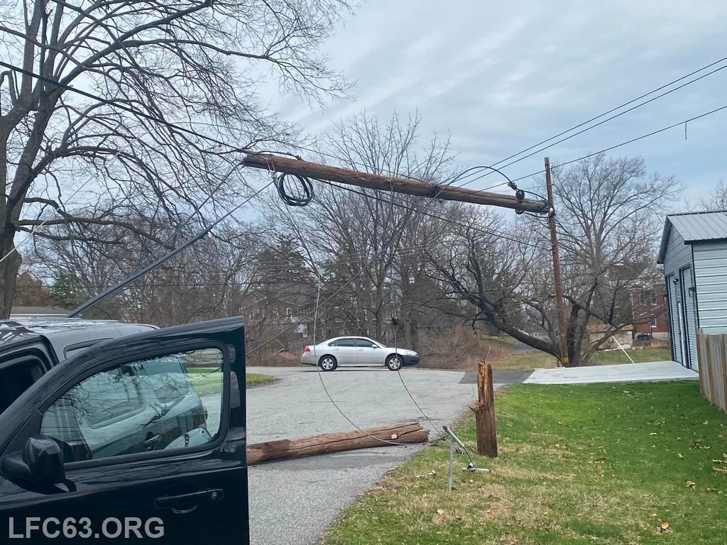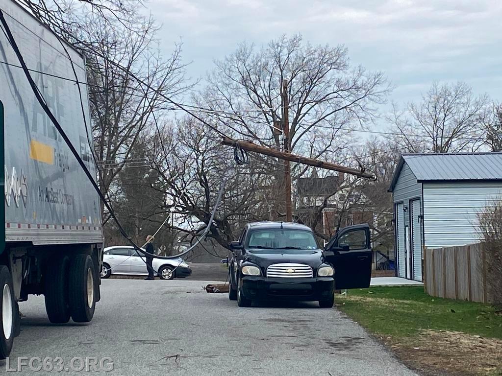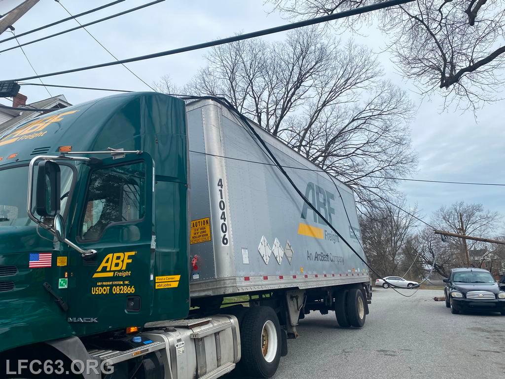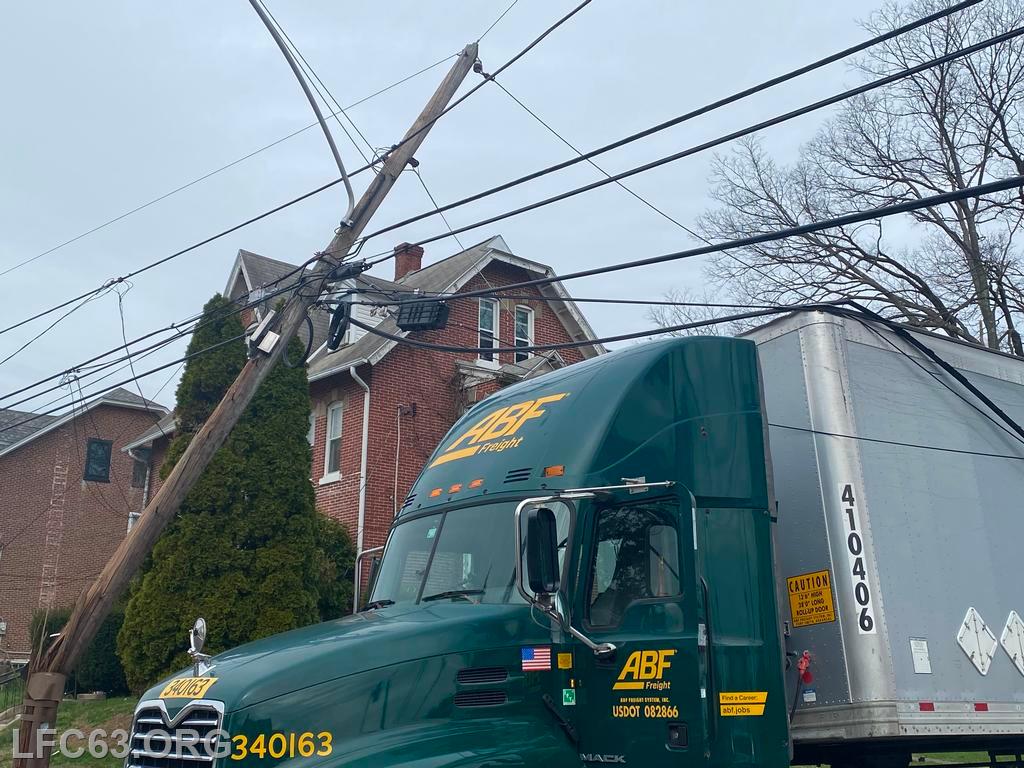 At 09.59 this morning LFC was dispatched to the area of 273 Chestnut Street for a reported pole fire, Squad 63 responded shortly after dispatch followed by Traffic 63 arriving on location Squad 63 found a Tractor Trailer had got caught in low hanging wires bringing two poles and several wires down in the roadway and immediately made a PECO notification. Squad 63 secured the area and Traffic 63 closed the roadway in both directions. Royersford Fire Department MENG98 also responded. Squad 63 and RFD went available about an hour later and Traffic 63 remained on location and cleared at 12.30 after the Spring City Borough Street Crew set road closed signs up while the Utility Crews worked on the problem.